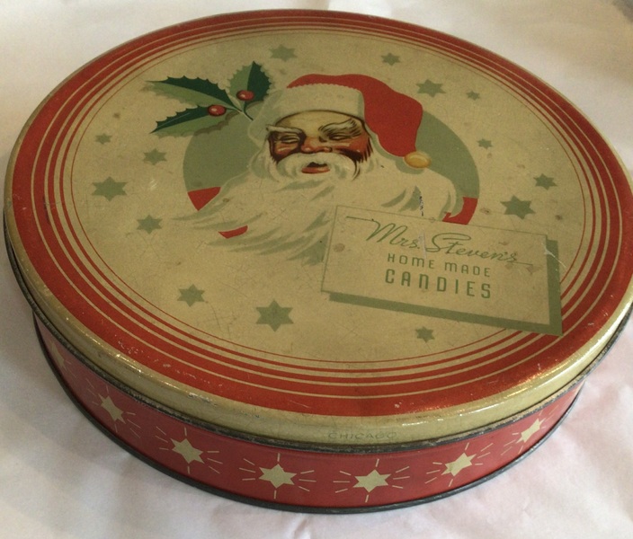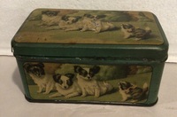 2 7/8” x 3” x 5 1/2”. Cute small box. Scrape on top. Tiny break in tin on cover.