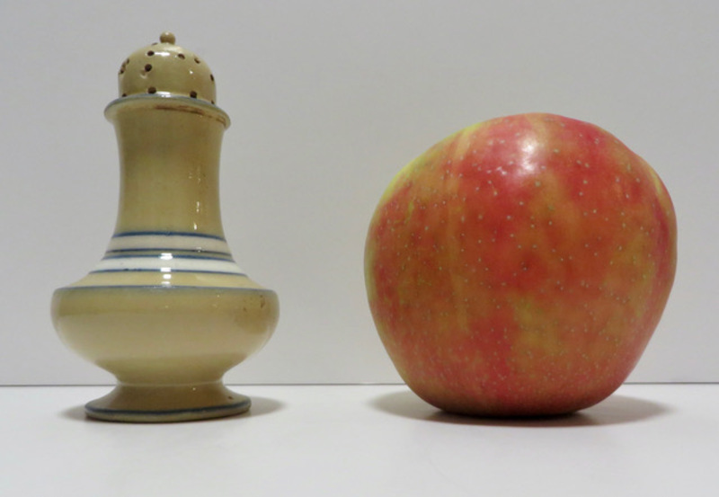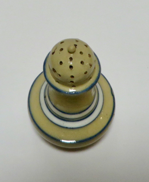 19TH CENTURY YELLOW WARE BANDED PEPPER POT –This is a 19th century yellow ware banded pepper pot. The pepper pot is decorated with a total of seven blue slip bands and two wider white slip bands. The shape/form of the pepper pot is different with a nice button finial, thumb flared body, and footed base. Measuring approximately 4 1/8” tall the pepper pot is in very good condition.