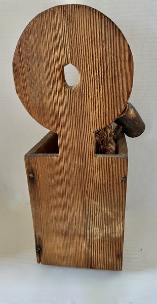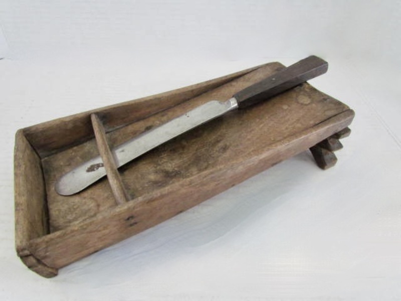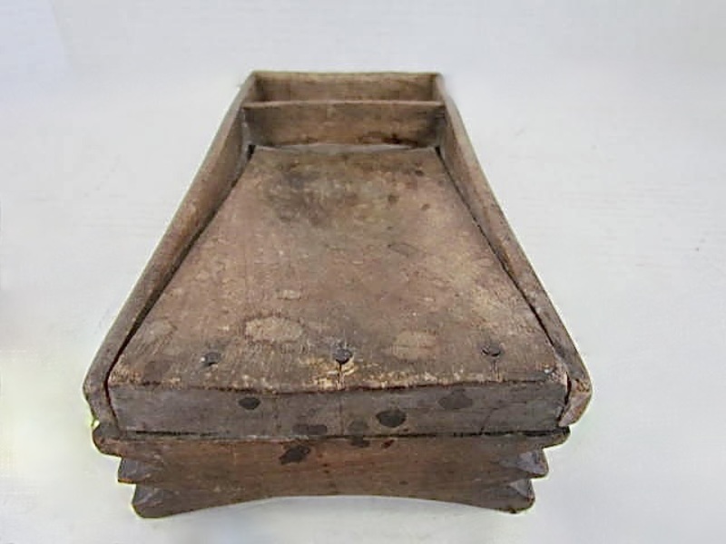 This little scrub box has some very nice features. I love the small size. I measures 9 1/2 inches x 4 1/4 inches. The box cants downward from 2 1/4 inches to 1 1/2 inches. The work surface has a unique opening cut into it so you can place the knife in place for scouring. The surface is original and greatly patinated. Constructed with small square nails. Notice the interesting cut out back elevation–a sweet little design touch. I believe the wood is Walnut.