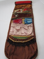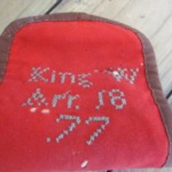 This is a wonderful 1877 Huswife. This lovely sewing notion is so decorative and unusual. Fancy with fabric, beads and color. The owners name “King W” and the date April 18, 1877 are on the front of the Huswife. Please notice the various shapes of the pockets, has a scissor holder . Many fabrics used, red wool, velvet, silk, ribbon and beads. This sewing rollup is from Kutztown, Pa. It measures 16inches long and 5 1/2 inches wide. Purchased from well known and admired Pa dealer Tex Johnson.