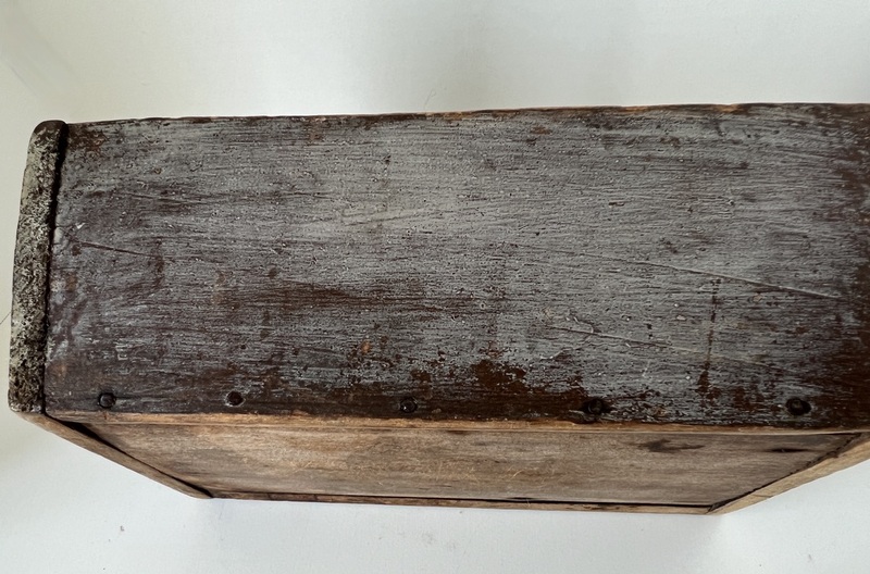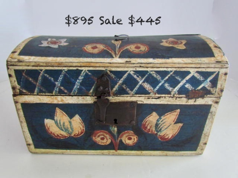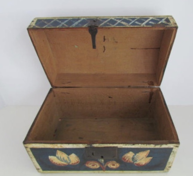 A very nice, smaller paint decorated box. Measures 10 1/4 “ x 6 1/4” x 6”. This Box is in very nice condition and comes from a private Virginia collection. The inside is signed box was probably a gift to a bride in the mid 1800s. The box is complete and still retains its Pin hinges and original lock and hasp. The paint is still strong and complete. There is a small checking crack on top of lid. Can be seen in picture. Circa mid 1800’s.