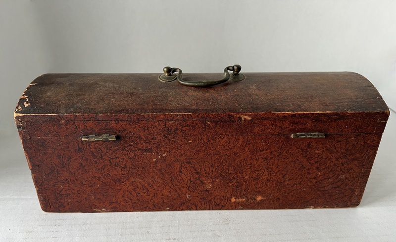 19th. Century Dome Table Box. A very nice table box from the late 19th. Century. The box is with dovetailed construction, all original condition. The paint on the box is wonderful, red/black design. Much of the paint is worn off the front and sides of the box. The back of the box has the most remaining paint. The dome box measures 12 1/2 x 4 1/2 x 4 inches.
