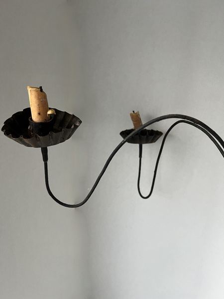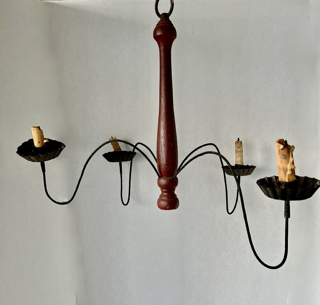 Four Candle Chandelier. A very nice price of vintage lighting. This chandelier would be considered vintage rather than antique. It has a great look, red painted shaft with four wire arms ending in crimped candle cups. The condition is excellent and the look sure would fit in any antique setting. The chandelier measures 15 inches tall to the iron ringand measures 21 inches diameter from candle cup to candle cup.