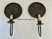 Wonderful Pair of Iron Sconces. What a great pair of sconces. Not often found, these are all done up in Iron. The form is simple and elegant—a flat circle back plate with extended arm that holds the candle cup. American Iron. Pair of candle sconces in excellent condition. The sconce back plate measures6 3/4 inches, they stand about 12 inches tall and come out from the wall about 3 1/2 inches.
