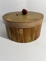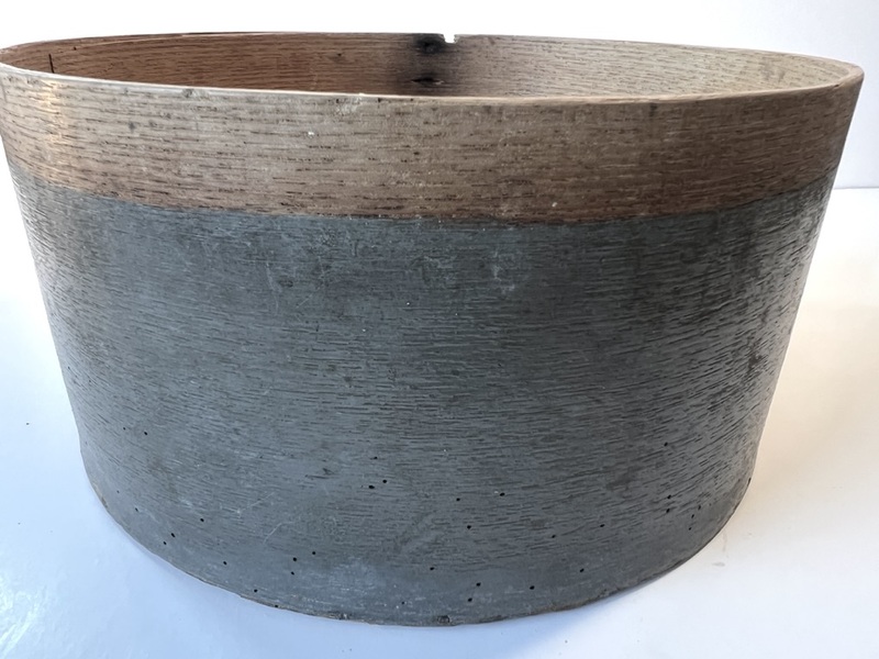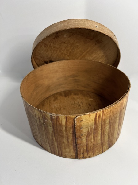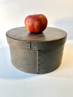 This is a very fine looking, c. 1850 round pantry box with original grain painted decoration in Mustard paint. This is possibly a Lancaster Co., Pa. piece as this style of grain painting is found on many utilitarian items from this area–e.g. buckets, firkins, salt boxes. All nails and pegs are present, and the paint is in excellent condition. The bottom has two exposed nails, but it is still tight. The lid fits snugly and has a few small rubs. It measures 9 1/2″ diameter and 5″ tall. It would be a stunning addition to a stack, but it is a great piece in its own right. The lid is original. I think the sides of the lid were just rubbed with white paint while the top of the lid was grain painted. This has been part of a CT collection.