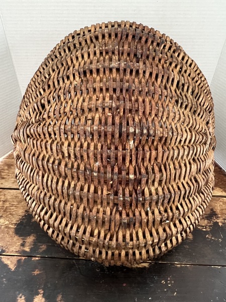 Fabulous Large Buttock Basket. A love late 19th./early 20th. Century buttock basket. The basket is in very good condition, however there are a few broken splints.Double Gods Eye, one on each side. The top of the wrap of one of the Gods Eye is loose. The bakset does have great patina. It measures 14 x 15 1/2 x 12 1/2 inches to the top of the handle. The handle is actually round bentwood rather than a flat piece of bentwood.