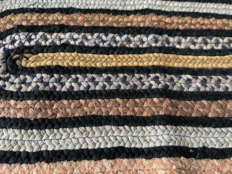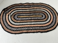 Small Table Rug. A very nice example of a table rug. Colors of salmon, black and cream. The table mat is in excellent condition. The table mat measures 22 1/2 x 12 1/2 inches.