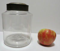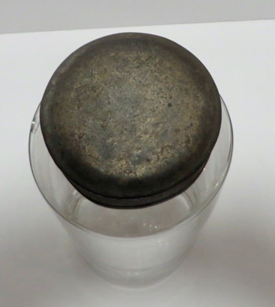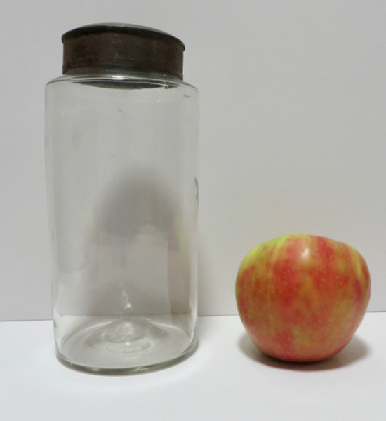 19TH CENTURY APOTHECARY JAR This is a wonderful 19th century apothecary jar. It has wonderful characteristics of old hand-blown glass. This includes waves, bubbles, and a very high pontil. The jar measures approximately 3 3/4" smooth top mouth diameter, 5 1/2” bottom diameter and is approximately 7 1/2” tall. The jar has an old tin lid and is in excellent condition.