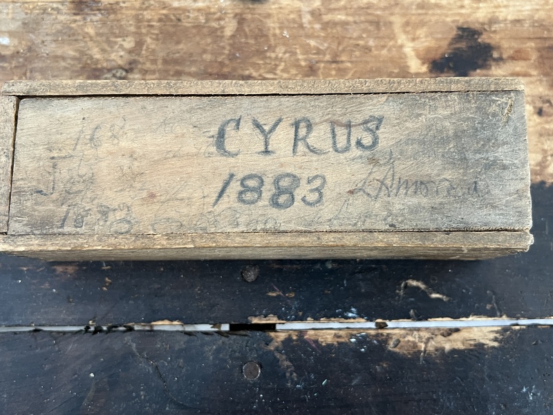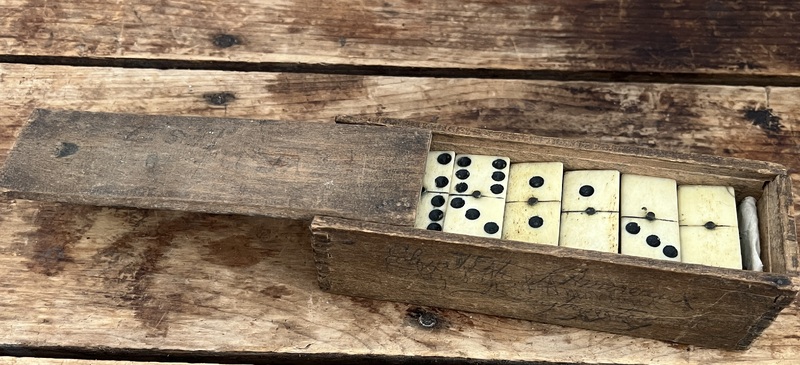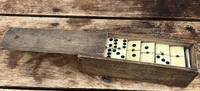 Set of Dominos A nice set of Dominos in original box. The set measures 6 1/2 x 2 x1 3/4 inches. There are pencil markings on the sides of the box but on the bottom of the box it is marked Cyrus 1883.