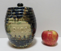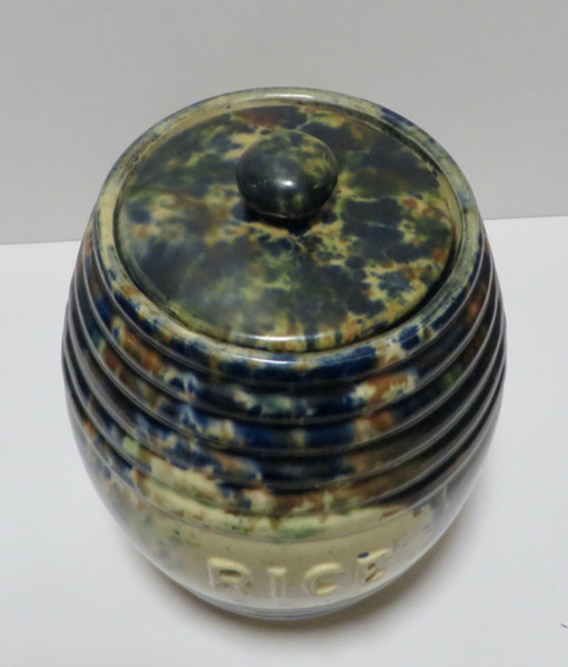 19TH CENTURY STONEWARE RICE LIDDED CANISTER– Circa 1879, this is a beautiful stoneware rice canister, commonly attributed to the pottery of William Crawford and Adam Morrison who founded the Rosslyn Pottery in Kirkcaldy, Scotland. The canister is designed in a barrel form with hoop rings and raised embossed “RICE” on one side. It has a beautiful blend of green, blue, and brown colors. The cannister measures approximately 4 1/2” top diameter and 4” bottom diameter and is 7 3/4” tall. It is in excellent condition and the lid is perfect.