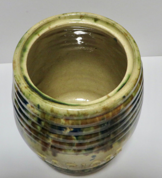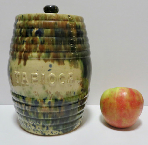 19TH CENTURY STONEWARE TAPIOCA LIDDED CANISTER– Circa 1879, this is a beautiful stoneware tapioca canister, commonly attributed to the pottery of William Crawford and Adam Morrison who founded the Rosslyn Pottery in Kirkcaldy, Scotland. The canister is designed in a barrel form with hoop rings and raised embossed “TAPIOCA” on one side. It has a beautiful blend of green, blue, and brown colors. The cannister measures approximately 5” top and bottom diameter and is 8 3/4” tall. It is in excellent condition and the lid is perfect.