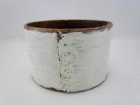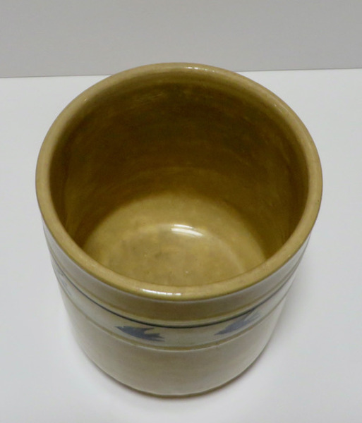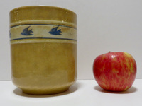 19TH CENTURY YELLOWARE CANNISTER – This is a 19th century yelloware cannister produced by Brush-McCoy. The cannister has two narrow raised white bands, two narrow incised blue bands, a ¾” white band decorated with eight bluebirds. It has a flared rim with two embossed rings just below the rim and a footed base. The cannister is well used with signs of aging and crazing which can be seen in the pictures. The cannister measures approximately 5 1/8” top diameter and 3 5/8” bottom diameter.