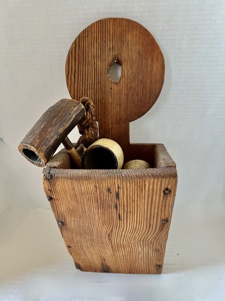 18th. Lollipop top wall box. Love this wall box, it has great form and construction. The wall box is circa late 18th. Century. The wood is Heartland Pine and indicates that this is most likely a Southern, American piece. The construction is with grand rosehead and square nails. The lollipop is truly magnificent and measures 6 1/4 inches in diameter. The wall box itself measures 16 1/2 inches tall by 6 x 5 1/2 inches at its widest part.