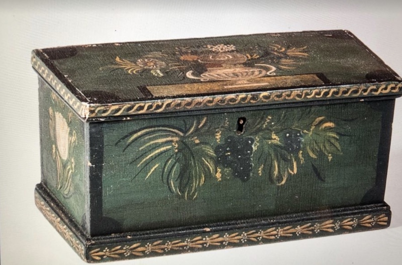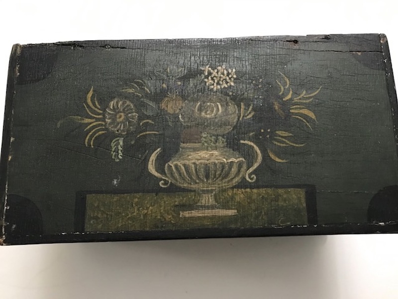 A very sweet painted table box. Wonderful green painted surface that is covered on all sides, back and lid with decorated flowers, design and initials. I believe this box has had some inpainting, done very well. There has also been some repair done to the hinges. The wood has been split there and repaired, see photos. The decorations on this box are so sweet and the initials on the back of the box are done extremely well. A very nice small size, it measures 9 1/4 x 4 3/4 x 5 inches.
