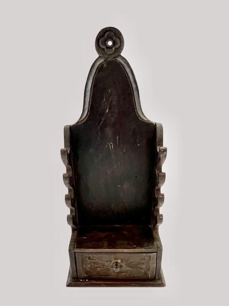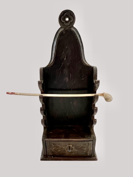 Late 19th. To early 20th. Century Pipe Rack with Drawer. A very nice pipe rack that holds pipes horizontally . The rack hold four pipes. The pipe rack has a drawer. The pipe rack is painted Black and has its original dark surface. . It measures 17 1/2 x 7 3/4 x 3 1/4.inches. Price: $325.00 + shipping Carved pipe box with dovetailed drawer and early accessory, original dark surface, mid 18th. Century. Carolyn Thompson. 7.5 x 17, $295.00 + 12 shipping.