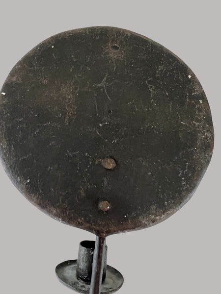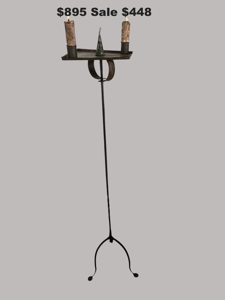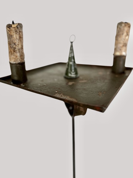 This is truly a charming piece of lighting. The make Do is circa 19th. century. The iron pole stands about 40 1/2 inches tall. The pole is iron and ends in three lovely penny feet. The lighting application is a 8 inch tin square with two candle cups. The square candle holder does not move down the iron pole. In the center of the tray is holder for a snuff. I truly believe these were matched up somewhere along the way, but what a perfect match and look. Charming country light. American ingenuity and country charm.