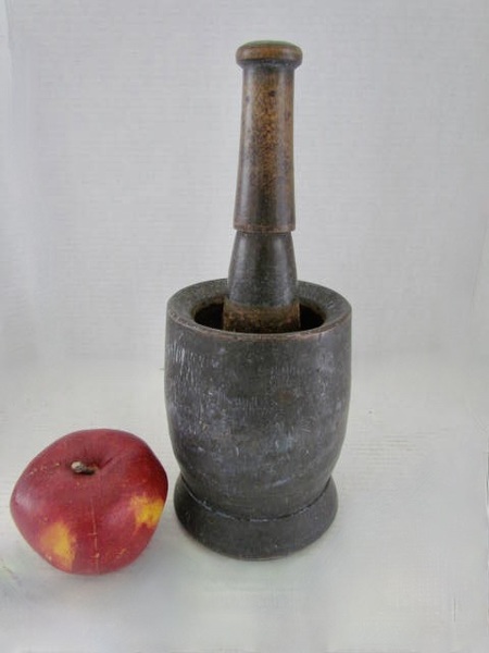 As Mortar/Pestles go this one is a 10. It has good age from the early 19th. century. Solid and heavy. The painted surface is fabulous. The body is painted a Blue and the cross design is of a Mustard or Ochre, quite striking. The pestle is original to the mortar. The overall condition is excellent. The mortar measures 6 1/2 inches tall, the top diameter measures 4 3/4 inches and the bottom diameter measures 4 3/4 inches. The Pestle measures 9 1/2 inches.Circa early 19th. century.