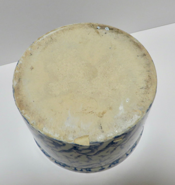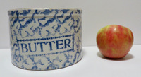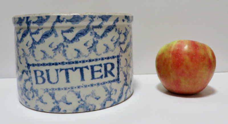 19TH CENTURY BLUE STONEWARE SPONGEWARE BUTTER CROCK – This is a nice 19th century stoneware butter crock. It is decorated in a cobalt blue spongeware pattern. The butter measures 7 3/8” in diameter and 4 7/8” tall. The butter itself is in very good condition with a chip on the bottom rim and a small flake chip on the side.