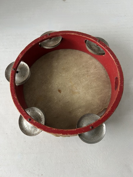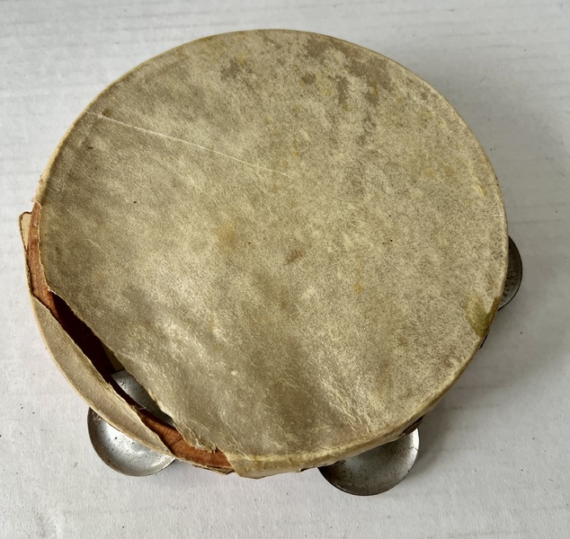 Tambourine. A very nice, early tambourine is most likely first part of the 20th. Century. The surface is some type of skin tightened over the round base.