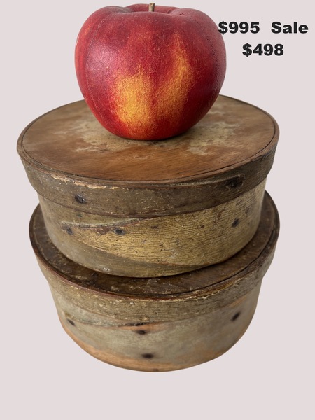 A nice pair of matching, Cream/Putty painted pantry boxes having opposing fingers. The boxes are heavy bodied with nice heavy lids. The paint is dry and original. The larger box measures 8 X 3 1/2 inches and the smaller one measures 7 x 3 inches. 19th. century round pantry boxes. American pantry boxes.