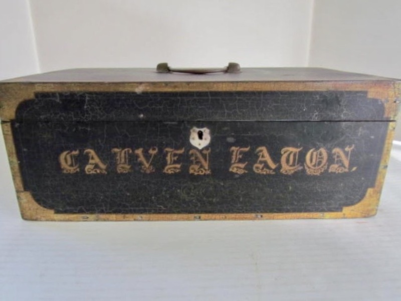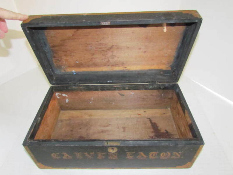 This is a 19th century painted document box that is signed Calvin Eaton on the front. It is square nail constructed with the original brass hinges, lock and handle with a mother of pearl inlay shield on the front. The paint is gold and black with red and green pinstriping with a Hitchcock design painted on the back. Found in Connecticut Measures: 8′ x 15″ by 5 3/4″ tall.