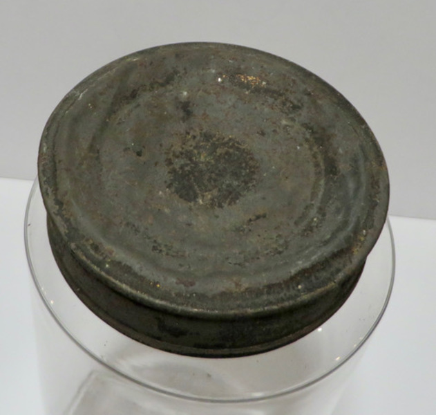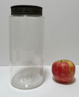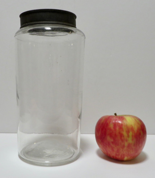 19TH CENTURY NARROW TALL APOTHECARY JAR #2 This is a wonderful 19th century apothecary jar. It has wonderful characteristics of old hand-blown glass. This includes waves, bubbles, and a high pontil. The jar measures approximately 3 3/8" smooth top mouth diameter, 4 3/4” bottom diameter and is approximately 10” tall. The jar has an old dimple tin lid and is in excellent condition.