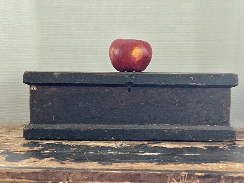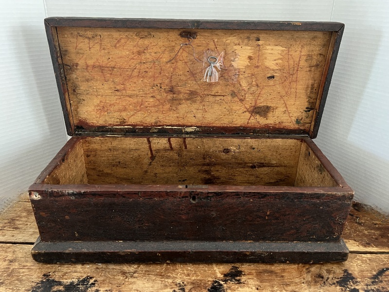 Painted Table Box w/Key. A truly lovely table box with original Brown painted surface. The mouldings on both the lid and around the base give this box a great country look. The proportions on the box, being a little longer than most, make it very appealing. the box measures 17x 7 1/2 x 5 1/2. The box comes with its original key.