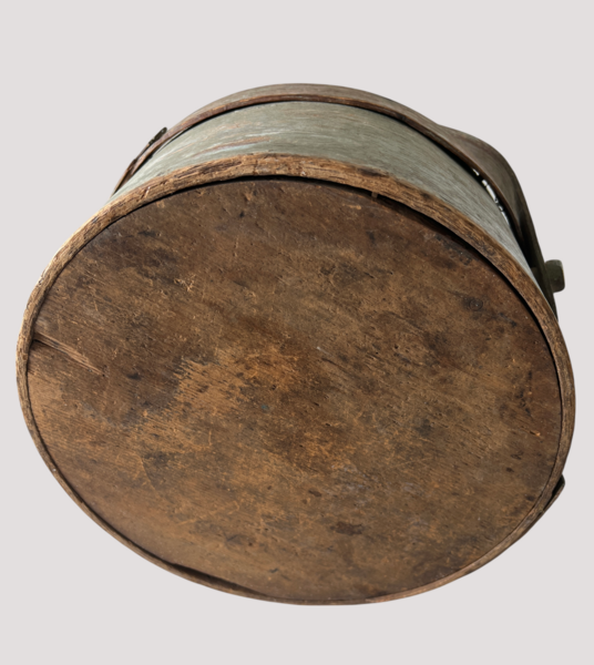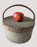 An outstanding bail handled pantry box. This wonderful pantry box has the nice bentwood handle that is secured with wooden plugs and pegs. The paint is fantastic, being a blue/grey, original surface. The pantry box is in excellent condition and measures 11 3/4 x 6 1/2 inches. American bail handled pantry box. Circa1879/1880.