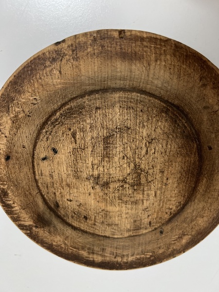 Super hard to find flat rim raised foot back Maple eating dish from the 17th early 18th century. This treen-ware wooden dish measures 7 1/4 by 7 3/8 and 1/4 inch thick either American or English being the form is 17th century it’s hard to tell. Great patina and knife marks front and back. Untouched and tough to find this early. 1680-1720. Such a great form.