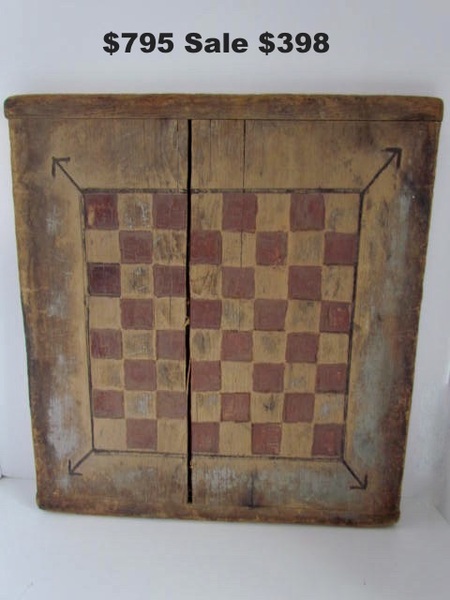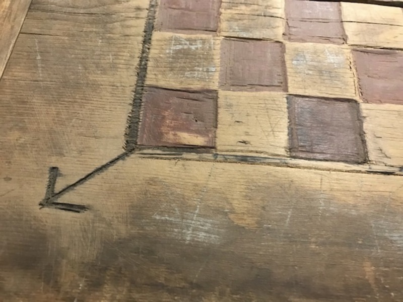 This is a wonderful 18th century one board checkerboard/gameboard. The gameboard measures 18 1/2” x 20 1/2” x 1″. The red squares are carved into the surface of the board making it dimensional as are the arrows that are in the corners. The gameboard has a wonderful dry natural surface on the odd squares. The board has traces of original grayish white paint that surrounded the checkered surface. The board originally 18 1/2 inches but because of age there is shrinkage crack in middle. The gameboard has its original breadboard sides with large square nails plus a few later nails. Rare and great folk art item. This s a great piece.