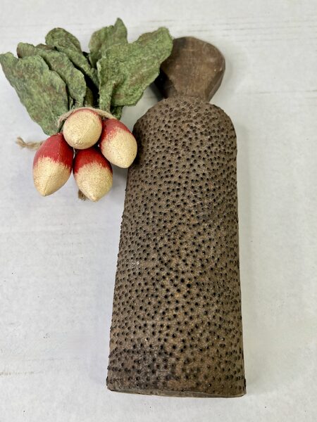 A very nice American punched tin grater. The tin punching on this grater is really intricate. The grater has a nicely shaped lollipop top. It measures 11 1/2 x 3 inches. Circa mid 19th. century and in excellent condition.