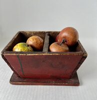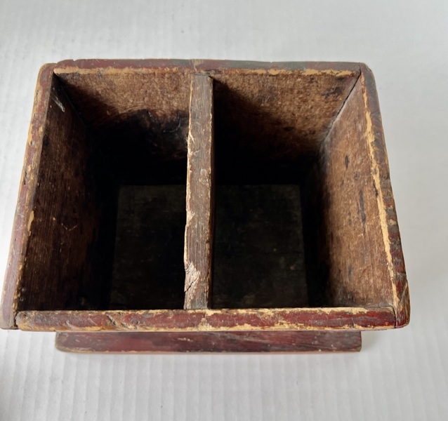 This is the sweetest little box. The proportions for the box, the original red paint, canted sides and the divided interior all make this box an attractive. It is a nice small size measuring 8 1/2 6 inches at the base and the box itself measures 6 1/2 x 8 x 4 1/4 inches. The paint is a nice worn red that is original to the box. I would date this box late 19th. to 1st quarter 20th century. Looks charming with just about anything in it.