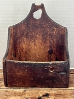 Early 19th. century small Wall box. A very nice late 18th. century wall box, constructed with rosehead and square nails. Original Red surface. Great small size measuring 12 /12 x 10 1/4 x 5 1/2 inches. Great wear to the hanging hole adds lost of character. Please note that there is “pop out” on the front right sice of the box. It is from a Pine knot that has dried over the years and just loosened and fell out.