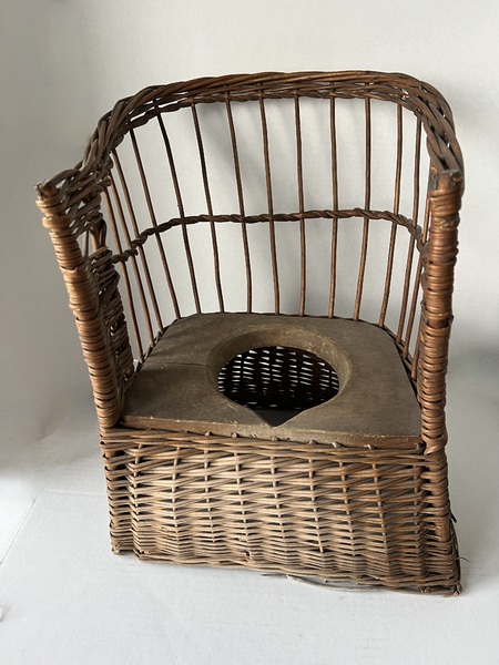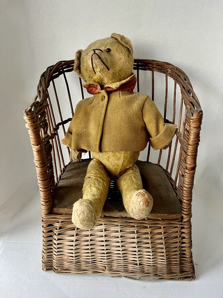 Mohair Teddy Bear w/ Wicker Potty. A very nice, early Mohair teddy bear. This bear has been love and cherished for years. It is straw filled. One hand is missing (see photo) and it does show wear to the mohair. Generally for its age and how much it was loved it is in very nice condition. I believe the jacket is original to the bear. It measures20 inches tall and has moveable joints, shoe button eyes and a loving smile. Wicker potty chair comes with the teddy bear. They look so welll together. The wicker potty is late 19th. early 20th. century. It is in excellent condition but there are a few missing wickets on the sides. The potty measurs17 3/4 inches tall and 11 1/2 inches wide
