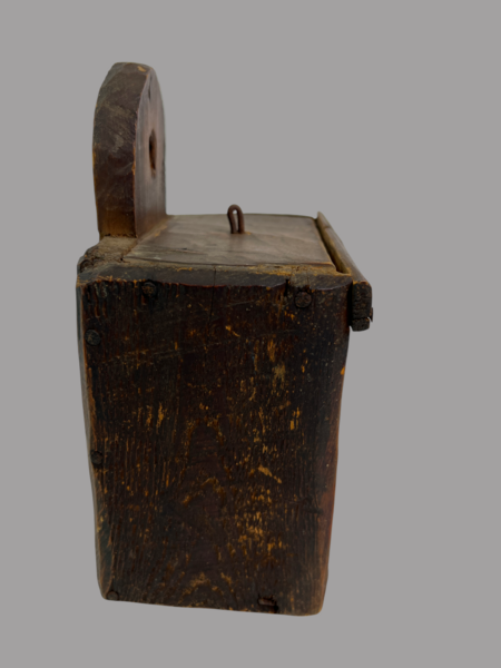 This watch hutch has such great primitive appeal. Clearly a home made piece to satisfy the desire of a loved wife. This hutch is a pure American primitive. Box shaped, never had a door or glass. Simply hang you pocket watch inside the primitive box and you are ready to set this piece on the hearth or table as needed, or it can be hung with the domes shaped back plate. The hutch measures 9 x 6 x 4 inches. It is in excellent condition and original surface. Pocket watch is not included.