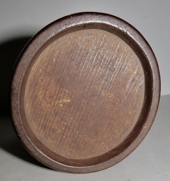 High country ighting stand or tidy for a candleholder. It is 7” tall x 6 7/8” dia. top and 6” dia. base. The wood appears to be walnut but hard to tell with certainty because of the original stained shellac or varnish. It is American or possibly English and dates mid to late 18th century. No issues. What appears to be a crack on the bottom is a flaw in the wood and does not show on the top. Brass capstan not included.