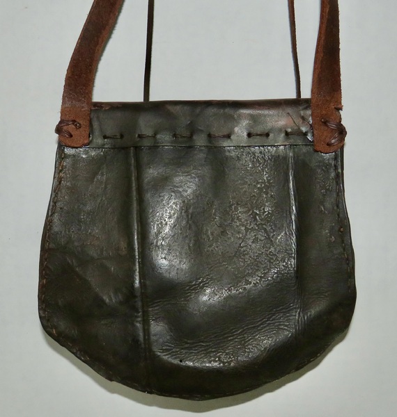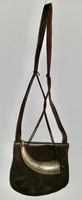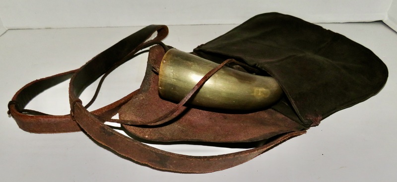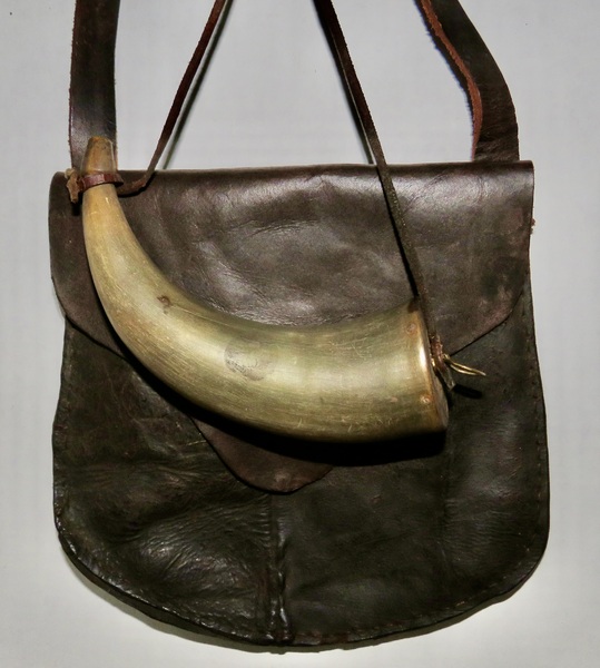 Rare 18th century, ca.1780-1820, beaver tail flap hunting bag with a powder horn. Great condition with original strap. Bag is 8 1/4” x 8”, still quite pliable, and powder horn is 6 1/2” o/a with early leather strap fastened to carrying strap. Rare to find this nice.