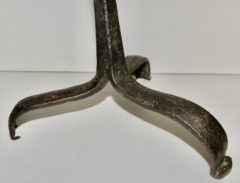 Forged iron floor standing candle stand and splint holder, one piece candle socket and arm for splint holder, one foot end worn down from use but the stand sits straight up and down. It is 31” tall with 8 1/2” across the legs. There are wonderful hand forging details. More photos are available. This wonderful lighting piece dates late 17th to early 18th century, c.1680-1740. A rare find. More photos are available.