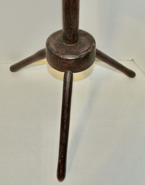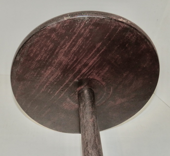 Very rare early 18th century wig or bonnet stand having octagon shaft and original linen and red cloth (hole worn through) on top. Original thick brown New England paint and a rosehead nail to expand the mortised through shaft. 12” tall with a 5” dia. base. Super wear from use. Rare to find.