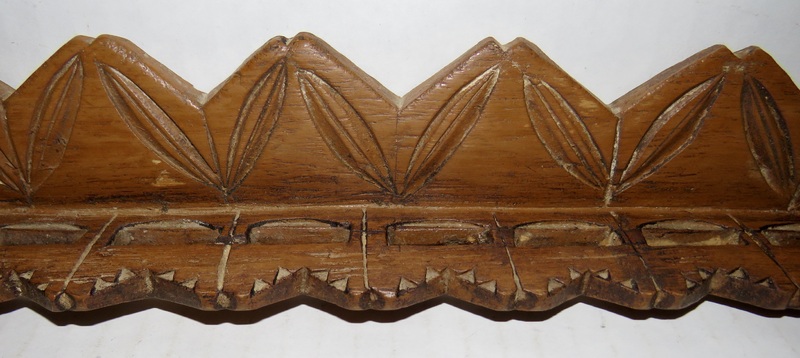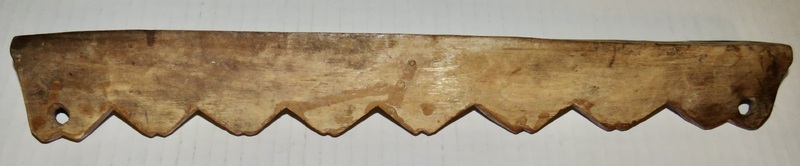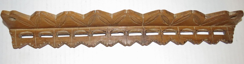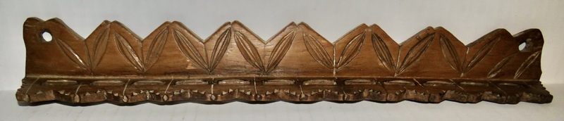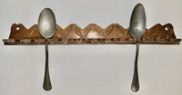 Spoon rack, walnut having original New England brown paint, chip carved with leaves and arrow heads, 12 slots for spoons, 2 hand carved hanging holes, it looks like the front part of the spoon slots may have broken and been reattached in the period. 16” long x 2” tall x 1 3/4” deep. Very dry surface, ca.1700-1740. Spoons not included.