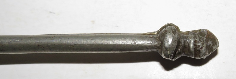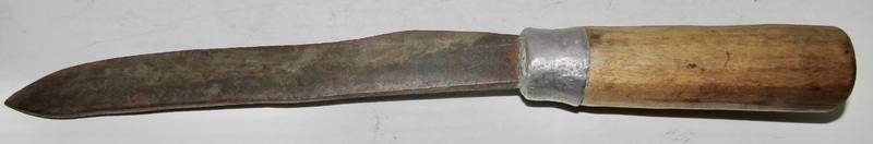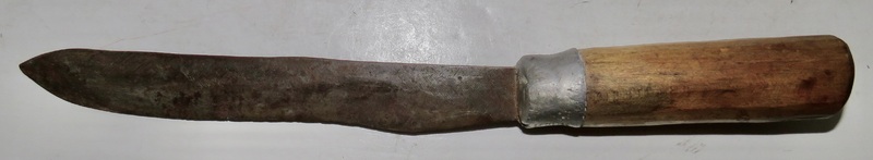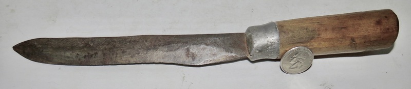 Rev. War era belt knife, pewter or lead ferrel, original handle, blade made from a file. 11 1/4” o/a with a 7” blade. No issues.
