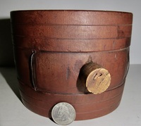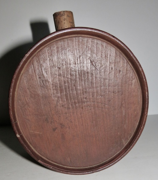 Rev. War period rundlet or canteen. Maple with pine ends. Nicely turned. Old cork stopper. Original wire shoulder strap guides with good shadow where strap was. Original New England red wash. 5 1/2” diameter x 4” wide. No issues. No common.