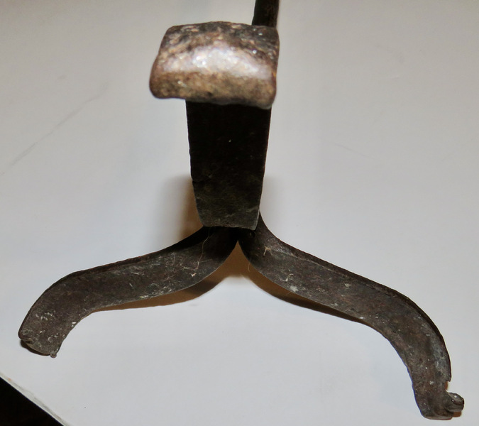 Early 18th century hand forged iron beam spike candleholder. 4 3/4” across the spike x 4 1/2” tall x 1 1/4” candle folded socket. Clean out hole and curl on end of spike.