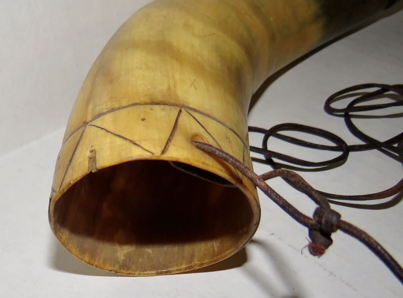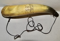 Blowing horn or hunting for calling hunting dogs out of the woods during a horseback fox or stag hunt. Signed and dated “T M F 1895”. Hand carved mouth end and decorated large end. Measures 11” o/a. Excellent color and condition. Original shoulder cord for carrying. Not common.