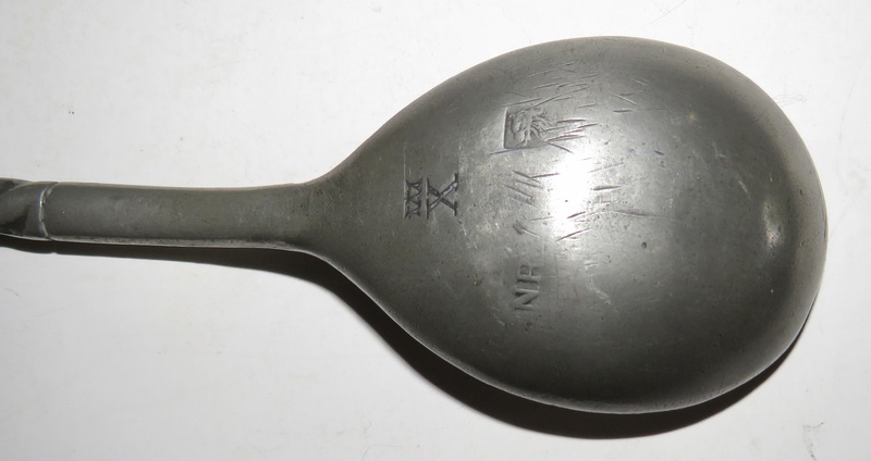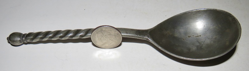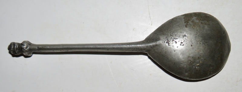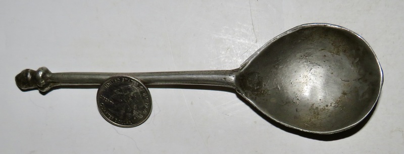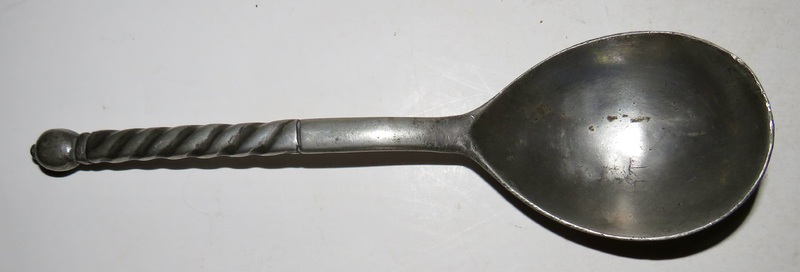 Early 17th century, ca.1580-1620, English pewter spoon. Twist stem with a knob top finial and hallmarks on back. 7” o/a with a 2” x 2 1/4” fig shaped bowl.