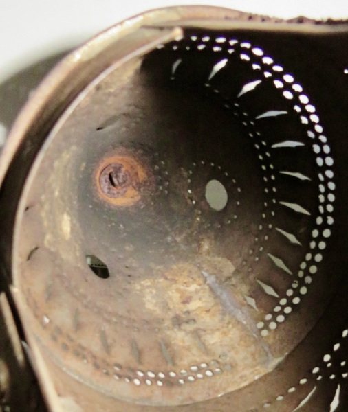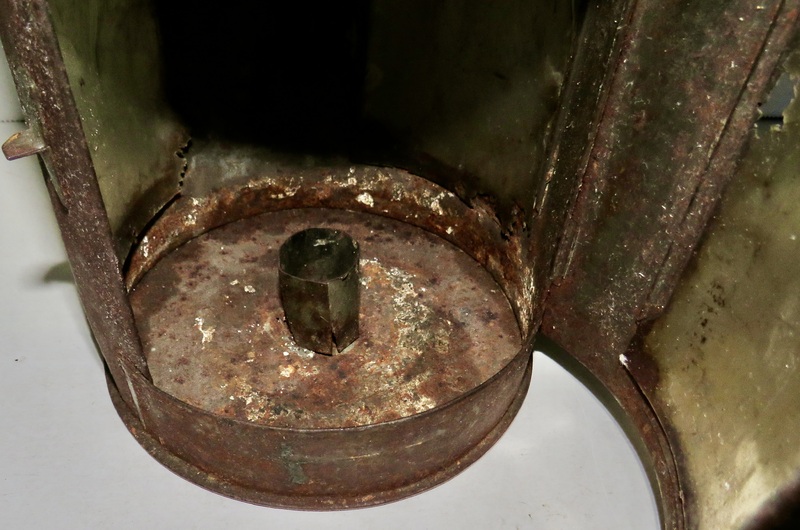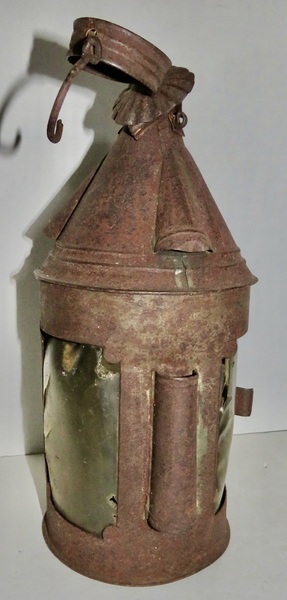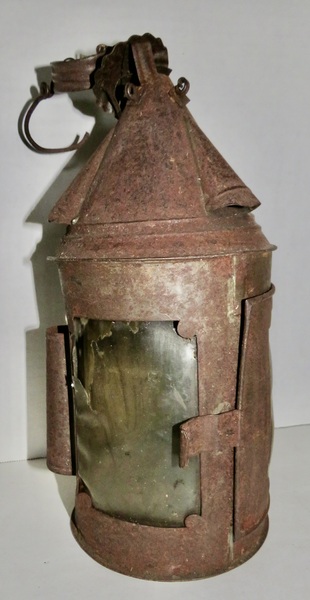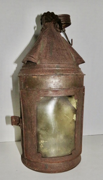 Lanthorn or horn and tin lantern having 3 shaved horn windows and a strap tin ring for hanging or carrying. There are 3 hooded ventilators to furnish necessary draft and an external holder for a pole for parade use. The windows have missing horn but approximately 90% is solid. 16 1/2” hanging height x 5 1/2” diameter. The tin pieces below the smoke bell have broken off but that doesn’t affect the handle. Ca. 1750-1820. Rare.