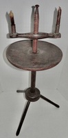 This is a not too often found plate warming stand or "cat". It is of English or American origin and made of maple wood. Measurements are 6 ¾” tall x 8” wide. Very skillfully turned legs. This stand is also called a “cat” because of the shape of the legs. No matter which 3 legs it rests on, there are always 3 legs to hold plates for warming on the hearth. C. 1760-1780. I have only owned 2 of these in my many years of collecting. Redware plate is not included but it is listed separately.