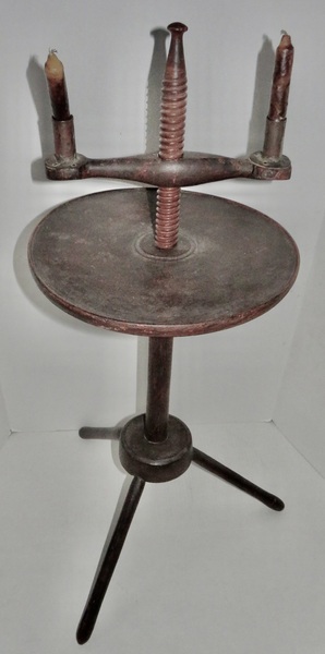 Wooden candle stand having Windsor legs, drip tray, and candle arm with 2 folded tin candle cups fastened to arm via tin plate and square nails. 34” tall with a 13”-13 1/2” tray having good shrinkage and very slight warp, and 19” between leg ends. Early Spanish brown paint over original red. Underside of tray has an old shellac or varnish finish. Good wear where to wooden threads. One of the legs has barely visible incised rings and is slightly bulbous at the rings. It may be an early replacement or is original. Ca. 1760-1790.