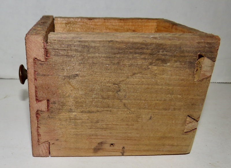 These are almost never found. A very small 3 finger Shaker pantry box. It is only 3 3/4” x 2 3/8” x 1 3/8” tall. It has a natural surface (there are traces of original red paint. It was common in the late 19th/early 20th century to strip paint from these boxes). The box has a good light shadow under lid, an indication of age. This small Shaker pantry box dates early to mid-19th c. Rare size. Ex. J. Stone collection, Madison, NY.