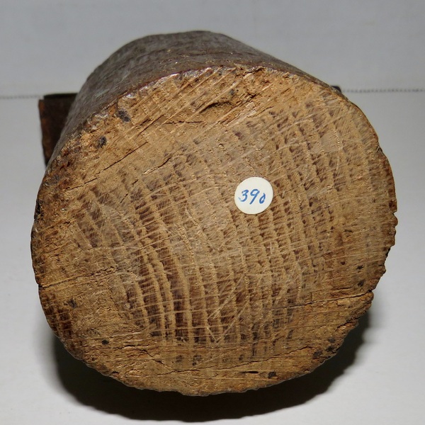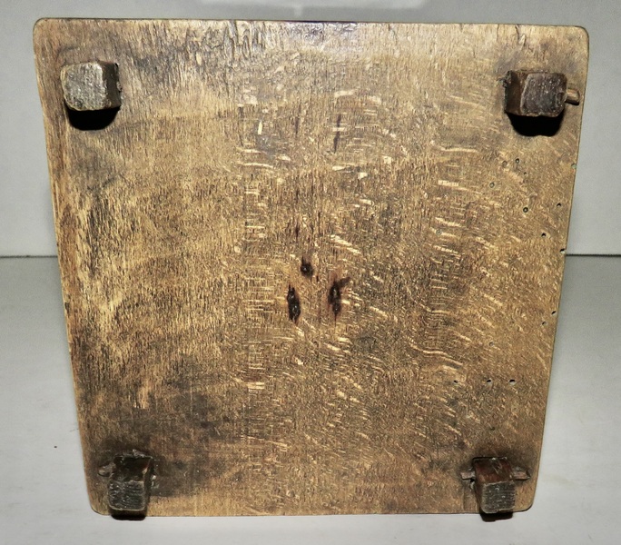 Early 18th century make -do candle lighting device. Maple wood base with untouched surface and initials “T N” carved into base. Forged seam on candle socket and a clean-cut hole. Minor tight shrinkage cracks. 6 1/4” tall with a 2 1/2” x 3 3/8” diameter base. VA collector.